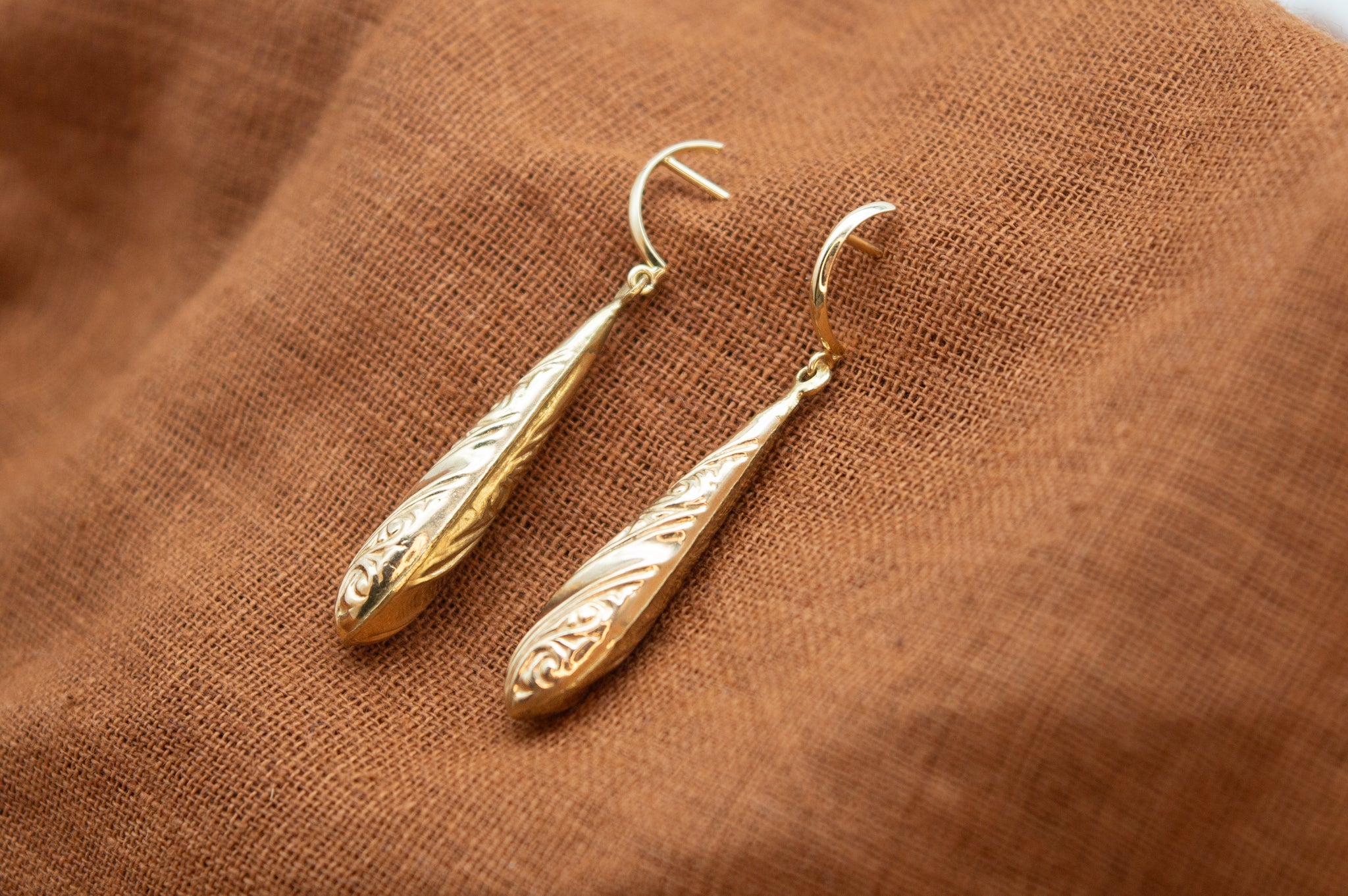 Vintage 9ct yellow gold torpedo earrings from the 1980s, expertly restored and reimagined for contemporary wear. Originally destined for recycling, these striking pieces have been fitted with modern half-hoop studs to replace their damaged original fittings. The hollow design ensures comfortable all-day wear despite their dramatic presence. Each earring showcases intricate scroll embossing and measures 40mm in drop length with a 5.2mm base width. Authenticated as 9ct gold, they also have 375 stamps on the posts, these statement earrings blend vintage character with refined craftsmanship.